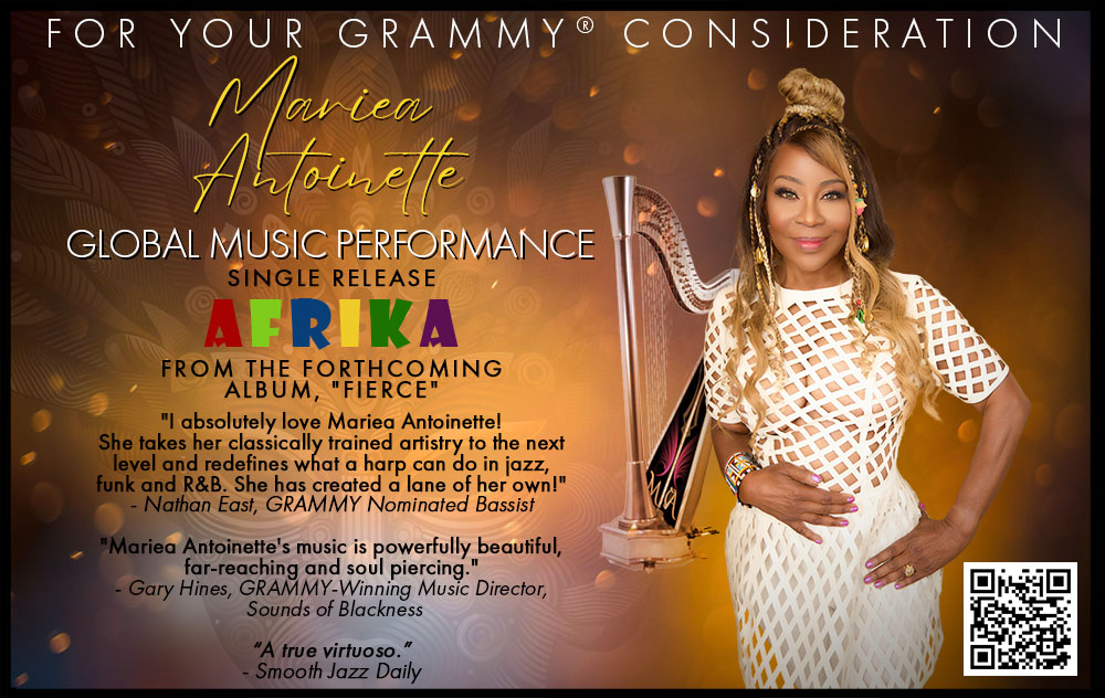 Celebrated harpist Mariea Antoinette is reaching new heights in her illustrious career, with her latest single, Afrika, climbing the charts. Known for her ability to merge classical harp with contemporary sounds, Mariea has cemented herself as a true innovator, captivating audiences worldwide with her unique artistry.